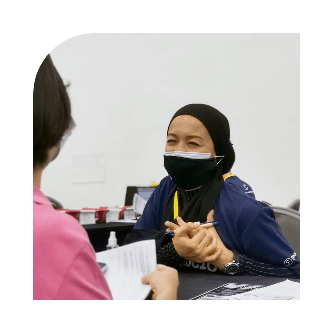 We ensure the safety of our teams and vaccinees by always following SOPs. While all our medical assistances, crew, and volunteers are 100% vaccinated, we practice double-masking, wearing face shield, and social distancing, this is how we "Lindung Diri, Lindung Semua"